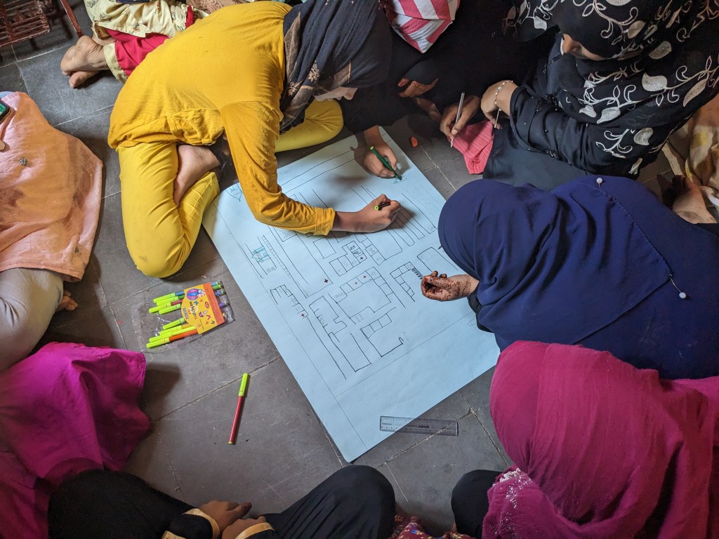 Safety Mapping is an interactive session where women and girls are encouraged to illustrate a map of their neighborhoods on a chart. They are prompted to identify and pinpoint the spots where harassment or cat-calling is frequent. Typically, these locations include chai tapris (local tea stalls), auto rickshaw stands, and busy junctions. These identified hotspots are marked by a vibrant red star symbol. A copy of the map is handed over to the nearby police station with a request for heightened patrolling at the hotspots.